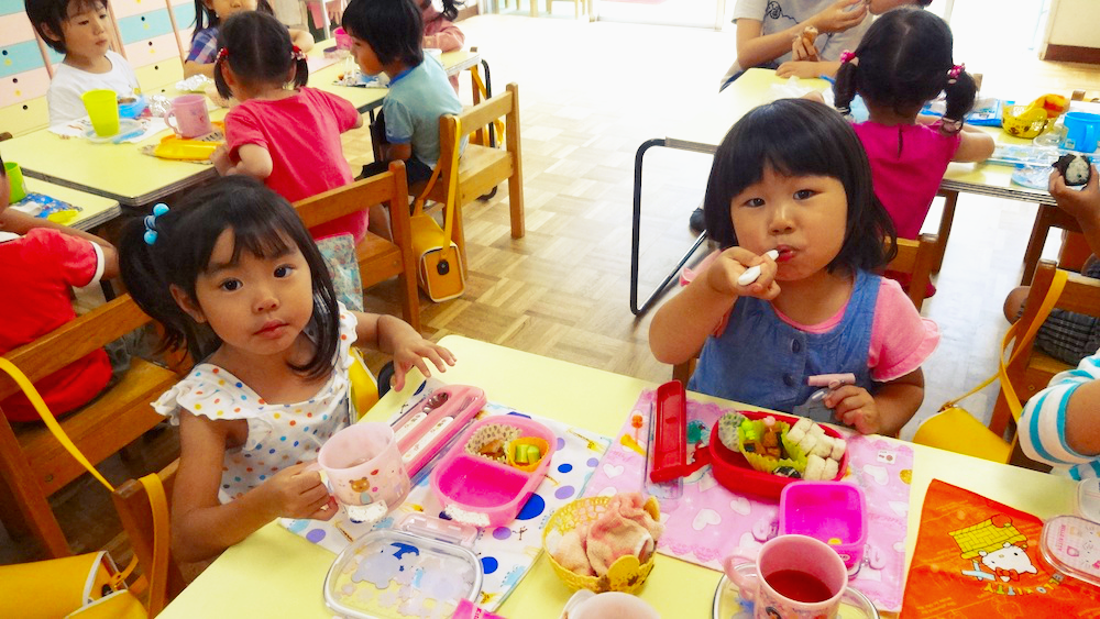 お昼は、家庭から持ってくる「お弁当」か「給食」どちらか選べるようになっております。